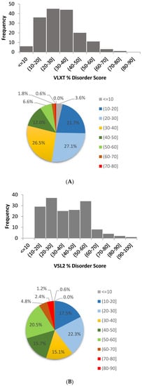 The per-residue disorder predisposition scores are on a scale from 0 to 1, where values of 0 indicate fully ordered residues, and values of 1 indicate fully disordered residues. Values above the threshold of 0.5 are considered disordered residues, whereas residues with disorder scores between 0.25 and 0.5 are considered flexible residues. For each protein, per-residue disorder predisposition values are summarized to produce global disorder predictions for the protein. The predicted average disorder score is defined by taking the arithmetic mean over all the residues to give the overall mean disorder score on the same 0 to 1 scale. The predicted percent disorder for each protein is defined as the ratio of the number of disordered residues (i.e., residues with the predicted disorder scores greater than 0.5) to the total number of residues and is given as a percentage. Based on their levels of average intrinsic disorder score, proteins were classified as highly ordered (average disorder score < 0.25), moderately disordered (average disorder score between 0.25 and 0.5) and highly disordered (average disorder score ≥ 0.5). Similarly, proteins can be classified based on their percent of predicted disordered residues (PPDR). Here, two arbitrary cutoffs for the levels of intrinsic disorder are used to classify proteins as highly ordered (PPDR < 10%), moderately disordered (10% ≤ PPDR < 30%) and highly disordered (PPDR ≥ 30%) [88]. The frequency distribution for the PPDR score for all three predictors are shown in Figure 3 and corresponding data are outlined below.