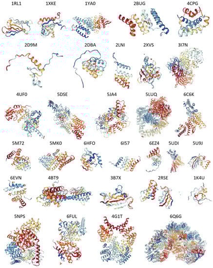 This fact is further illustrated by Figure 13, showing the fractions of these proteins represented by the experimentally validated ordered domains. This analysis reveals that there is a week anti-correlation between the structural coverage of 56 human TPR proteins evaluated for each protein as percent of its sequence that is mapped to all the known structures and intrinsic disorder predisposition calculated as corresponding PONDR® FIT-based PPDR values. Figure 13 shows that no structure is currently available for any TPR protein with disorder content exceeding 55%. Furthermore, one can see there an expected trend, where more disordered proteins show less structural coverage. Furthermore, some of the structures shown in Figure 12 are not the TPR motifs of the corresponding proteins but rather represent other functional domains. For example, structures with the PDB IDs 1RL1, 5U9J, and 3B7X that contain noticeable levels of β-structure correspond to the bipartite CS domain (which is a ~100-residue protein-protein interaction module named after CHORD-containing proteins and SGT1) of human protein SGT1 homolog (PDB ID 1RL1), PPIase FKBP-type domain of aryl-hydrocarbon-interacting protein-like 1 (AIPL1; PDB ID: 5U9J), and another PPIase FKBP-type domain of the inactive peptidyl-prolyl cis-trans isomerase FKBP6 (PDB ID: 3B7X). Furthermore, some of the structures shown in Figure 12 contain noticeable disordered regions.