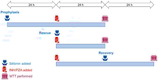 In measuring the toxicity of silibinin, INH, and PZA on cells, a series of concentrations was prepared in media and administered to silibinin for 24 h, after which the cell viability was measured. To simulate silibinin’s role as a preventive agent, the cells were treated with silibinin for 24 h, then with both silibinin and the toxicants for a further 24 h, before cell viability was assessed. To simulate silibinin’s role as a rescue adjuvant, the cells were treated with both silibinin and the toxicant for 24 h before cell viability was assessed. To simulate silibinin’s role as a recovery adjuvant without washout, the cells were treated with the toxicant for 24 h, then with silibinin and the toxicants for a further 24 h, before cell viability was assessed. To simulate silibinin’s role as a recovery adjuvant with washout, the cells were treated with the toxicant for 24 h, then with only silibinin for a further 24 h, before the cell viability was assessed.