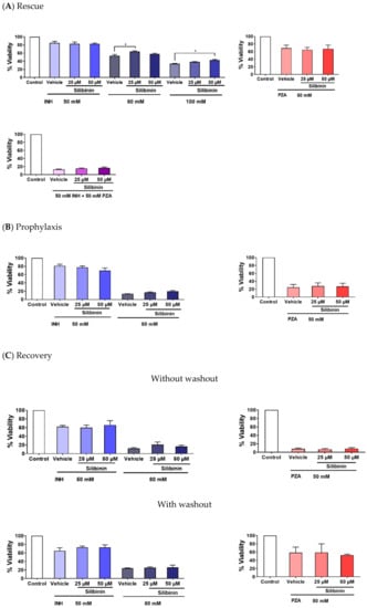 Silibinin mitigated isoniazid (INH)-induced hepatotoxicity, but not pyrazinamide (PZA)-induced hepatotoxicity. (A) Co-administration of silibinin at 25 µM reduced hepatotoxicity induced by 80 mM (one-way analysis of variance (ANOVA), p = 0.0231). Similarly, co-administration of silibinin at 50 µM reduced hepatotoxicity induced by 100 mM INH (one-way ANOVA, p = 0.0201). Co-administration of silibinin at either 25 or 50 µM, but did not reduce hepatotoxicity induced by 50 mM INH, 50 mM PZA, or a combination of INH and PZA (I/P) at 50 mM each (I/P 50/50). (B) Pre-administration of silibinin for 24 h, followed by the co-administration of silibinin with INH or PZA for a further 24 h, did not prevent hepatotoxicity induced by 50 mM INH, 80 mM INH, or 50 mM PZA. (C) Administration of INH or PZA for 24 h, followed by the administration of silibinin alone (with washout) or silibinin with INH or PZA (without washout) for a further 24 h, did not aid in the recovery of LO2 from 50 mM INH, 80 mM INH, or 50 mM PZA. Data represent mean ± S.E.M. of at least two replicates. * p < 0.05 vs. respective vehicle controls.