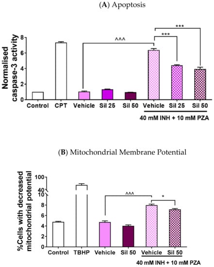 Silibinin reduced apoptosis when co-administered with a combination of INH and PZA by maintaining mitochondrial membrane potential. Various concentrations of silibinin were co-administered with I/P 40/10 over 18 h. (A) The administration of I/P 40/10 significantly increased caspase-3 activity (one-way ANOVA, p < 0.0001). The co-administration of silibinin with I/P 40/10 reduced the activity of caspase-3 when silibinin was administered at 25 μM (one-way ANOVA, p < 0.0001) and 50 μM (one-way ANOVA, p < 0.0001), suggesting that there was a reduction in apoptotic activity. The positive control was treated with camptothecin (CPT) 5 μM for 24 h. (B) The administration of I/P 40/10 negatively affected LO2 cells’ membrane potential (one-way ANOVA, p < 0.0001). Silibinin of 50 μM reduced the percentage of cells whose membrane potential was negatively affected by I/P 40/10 (one-way ANOVA, p = 0.0234). Positive control was treated with the oxidising agent TBHP 200 μM for 1 h. Data represent mean ± S.E.M. of three replicates. * p < 0.05, *** p < 0.001 vs. vehicle control co-administered with I/P 40/10, ^^^ p < 0.001 vs. respective vehicle controls.