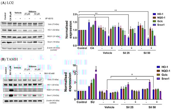 Silibinin induced expression of proteins in the nuclear factor (erythroid-derived 2)-like 2 (Nrf2)–antioxidant response element (ARE) pathway and restored protein expression. Vehicle control was treated with 0.05% v/v dimethyl sulfoxide (DMSO). ‘−’ denotes conditions without toxicant cotreatment; ‘+’ denotes conditions with toxicant cotreatment. (A) In LO2, silibinin’s reduction of ROS levels when co-administered with I/P 40/10 was independent of heme oxygenase-1 (HO-1) protein restoration. The administration of I/P 40/10 significantly reduced HO-1 levels without silibinin (one-way ANOVA, p = 0.0150), or with silibinin at 25 μM (one-way ANOVA, p = 0.0051) and 50 μM (one-way ANOVA, p = 0.0022). Positive controls were treated with the Nrf2–ARE inducer trans-cinnamaldehyde (CA) 50 μM for 24 h. Data represent mean ± S.E.M. of three replicates. * p < 0.05, ** p < 0.01 vs. negative control. (B) In transforming growth factor-α transgenic mouse hepatocytes (TAMH), 50 μM silibinin alone induced sulfiredoxin 1 (Srxn1) expression (one-way ANOVA, p = 0.0237), but the co-administration of silibinin with 40 mM INH did not restore Srxn1 expression to pre-suppression levels (one-way ANOVA, p = 0.0551). In contrast, 50 μM silibinin restored HO-1 expression (one-way ANOVA, p = 0.0333), but did not induce HO-1 when was administered alone (one-way ANOVA, p = 0.0564). This effect did not extend to glutamate-cysteine ligase catalytic subunit (Gclc) and NAD(P)H quinone dehydrogenase 1 (NQO1) restoration. Positive controls were treated with the Nrf2–ARE inducer sulphoraphane (SU) 10 μM for 24 h. Data represent mean ± S.E.M. of two replicates. * p < 0.05 vs. vehicle control, ^ p < 0.05 vs. vehicle control co-administered with hepatotoxic regimen.