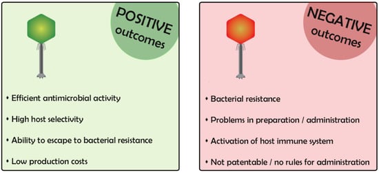 Bacteriophages (phages) are viruses that specifically infect and multiply within the bacteria [1]. The use of phages to counteract bacterial infection dates to almost one century ago, and their use has never been abandoned completely, although it was mostly eclipsed by the advent of antibiotics. Nowadays, phages are regaining interest to overcome the development of antibiotic resistant bacteria [2]. However, phages are extremely appealing but also frightening in some aspects, particularly due to the incomplete knowledge of their mechanism of action. In the first part of this review, we describe phage characteristics, highlighting positive and negative aspects for their use in clinics (Figure 1).