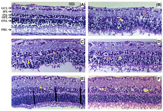 Effect of several concentrations of epigallocatechin 3-gallate (EGCG) on morphological changes induced by retinal ischemia/reperfusion (rI/R). (A) Sham group; (B) vehicle-treated rI/R (rI/R-veh); (C) treated with EGCG at 1.5 (rI/R-E1.5); (D) at 7.5 (rI/R-E7.5); (E) at 15 (rI/R-E15), and (F) at 30 mg/kg (rI/R-E30). Pinocytic nuclei and vacuolization are showed in yellow and orange arrowheads, respectively. Ganglion cell layer (GCL) shows vacuolated cells and nucleomegaly. In the outer plexiform layer (OPL), a vacuolated aspect with an eosinophilic area is observed. IPL, internal plexiform layer; INL, internal nuclear layer; outer nuclear layer ONL; and photoreceptor layer (PRL). Hematoxylin and eosin staining. Scale bar = 100 μm.