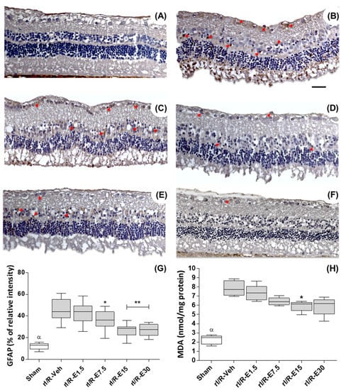 Effect of EGCG concentration on retinal protection at 48 h after rI/R. Gliosis retinal was measured by glial fibrillary acidic protein (GFAP) immunostaining (red arrows show representative cells). Lipid peroxidation levels were determined by malondialdehyde formation (MDA) assay. (A) sham group; (B) rI/R-veh; (C) rI/R-E1.5; (D) rI/R-E7.5; (E), rI/R-E15, and (F) rI/R-E30. The (G,H) show the Box-and-whisker plot (median, first-third quartile, minimum- maximum value) with the percentage of GFAP staining intensity and MDA formation levels, respectively. * p < 0.05, ** p < 0.01 compared to rI/R-veh, and α p < 0.01 compared to all groups. Scale bar = 100 μm.