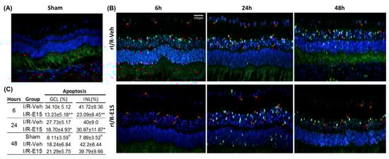 Neuroprotective effect of EGCG at 15 mg/kg (E15) in a timeline. Apoptosis was determined by terminal deoxynucleotidyl transferase dUTP nick end labeling (TUNEL) assay. (A) Sham group at 48 h after rI/R; (B) vehicle-treated groups at the 6, 24, and 48 h after rI/R (rI/R-veh; upper panel) and E15-treated group at the same times (rI/R-E15; bottom panel). Some apoptotic cells are highlighted with red arrows and their nuclei stained with DAPI (blue). In (C), the mean ± SD percentage of positive cells in the INL and GCL are shown. * p < 0.05 and ** p < 0.01 compared to rI/R-veh, and α p < 0.01 compared to rI/R-veh and rI/R-E15 groups, at 48 h. Scale bar = 100 μm.