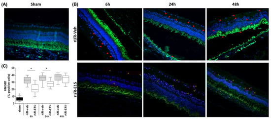 The neuroprotective role of E15 also was determined by the grade of necrosis after rI/R in the timeline using the high-mobility group box-1 (HMGB1) immunostaining as a marker. In rI/R-veh and rI/R-E15 groups, the stain of HMGB1 in the GCL, INL, and photoreceptor layers were observed (Figure 4B, upper and bottom panels). However, rI/R-15 at 6 h showed the lowest number of stained cells. In rI/R-E15 (at 6 and 24 h), the HMGB1 staining percentage was significantly lower when compared to rI/R-veh (p < 0.05) (32.91 ± 4.77 vs. 21.43 ± 6.31 at 6 h; 36.19 ± 4.78 vs. 28.16 ± 4.30 at 24 h). However, at 48 h, the HMGB1 percentage was not-significantly modified between rI/R-veh and rI/R-E15 (37.25 ± 4.96 vs. 34.89 ± 5.87, respectively). Figure 4C shows a plot (median, first-third quartile, minimum-maximum value) with the grade of retinal necrosis according to the percentage of HMGB1-positive cells after rI/R. A sham group was also included (Figure 4A).