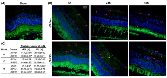 The antioxidant effect of E15 related to nuclear staining of nuclear factor E2-related factor 2 (Nrf2). The antioxidant effect was determined by nuclear immunostaining of Nrf2 after rI/R in the timeline. (A) Sham group at 48 h; (B) rI/R-veh at 6, 24, and 48 h after rI/R (upper panel), and rI/R-E15, at the same times (B; bottom panel). The nuclear (red arrows) and cytoplasmic (yellow arrows) Nrf2 staining and their nuclei stained with DAPI (blue) are showed. In (C), the table shows the nuclear percentage of NrF2 in INL and GCL (mean ± SD). * p < 0.05 compared to rI/R-veh and α p < 0.01 compared to rI/R-veh and rI/R-E15 groups, at 48 h. Scale bar = 100 μm.