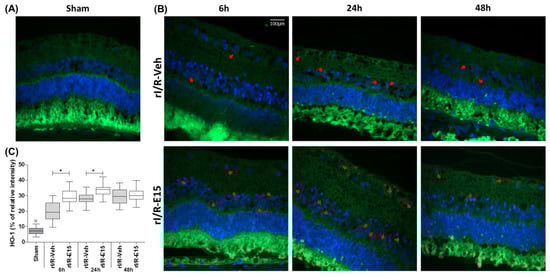 The staining intensity of HO-1 in the retinas was further confirmed by quantifying its expression levels through qPCR (Figure 7A). Compared to rI/R-veh, the levels of Ho-1 mRNA in rI/R-E15 at 6 and 24 h were increased (1.5 ± 13.31 and 1.5 ± 13.3 times, respectively) suggesting that E15-treated rI/R can activate the antioxidant pathway of Nrf2/HO-1. However, Ho-1 mRNA levels between rI/R-veh and rI/R-E15 were not significantly different at 48 h.
