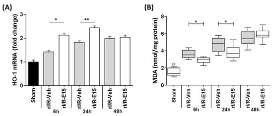 The E15 effect on Ho-1 expression and lipid peroxidation level after rI/R in the timeline (6, 24, and 48 h). (A) Shows the fold changes of Ho-1 mRNA quantified by qRT-PCR (mean ± SD) and (B) shows a Box-and-whisker plot (median, first-third quartile, minimum- maximum value) with MDA levels formation by TBARS assay. * p < 0.05, ** p < 0.01 compared to rI/R-veh. α p < 0.01 compared to rI/R-veh and rI/R-E15 groups, at 48 h.