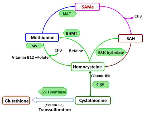Homocysteine (HCY), a sulfurated amino acid, is formed in methionine turnover by the conversion of SAH in to homocysteine and adenosine by SAH hydrolase (SAHH) [5] (see Figure 1). Nearly 50% of formed HCY is further converted to cysteine by the transulfuration pathway [3,4] for further glutathione formation. It was shown that the SAMe intracellular level is a modulator factor, that controls by which pathway either re-methylation or transsulfuration, homocysteine will be eliminated [3]. Thus, higher levels of SAMe facilitate the transsulfuration pathway and therefore glutathione formation. However, SAMe deficiency cause a shift to homocysteine remethylation and de novo methionine formation in the presence of vitamin B12 and folate as a co-factors [3,5,62]. Moreover, the SAH hydrolase is a reversible enzyme that was prompted to re-form SAH in the case of elevated HCY levels and therefore affect the SAMe/SAH ratio, causing the inhibition of all methylation reactions [3]. Thus, a glitch in any step in a methionine turnover, due to dietary deficiency in methionine, vitamin 6, vitamin B12, or folate, may cause a vicious circle that can contribute to the development of many diseases states.