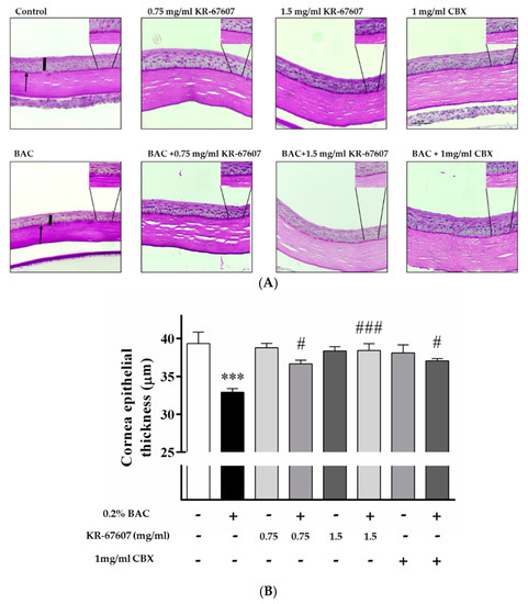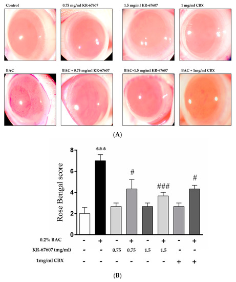 0.2% BAC (Sigma-Aldrich, St. Louis, MO, USA) was used to induce DES. We dissolved the KR-67607 or CBX (Amifinecom Inc., Pertersburg, VA, USA) in 5% dimethyl sulfoxide (DMSO; Sigma-Aldrich, St. Louis, MO, USA). Animals underwent the following eight treatments: Control, 0.2% BAC, 0.2% BAC + 0.75-mg/mL KR-67607, only 0.75-mg/mL KR-67607, 0.2% BAC + 1.5-mg/mL KR-67607, only 1.5-mg/mL KR-67607, 0.2% BAC + 1-mg/mL CBX, or only 1-mg/mL CBX treatment. Drugs were administrated topically (one drop, 20 μL) twice a day (09:30, 17:30) for 10 days.