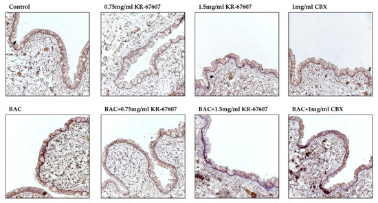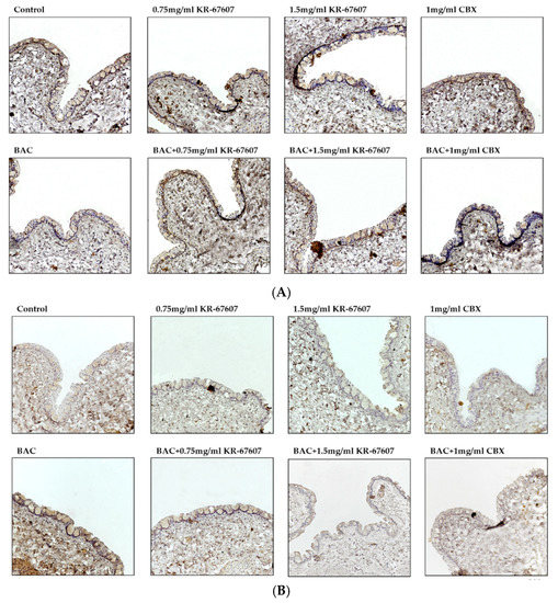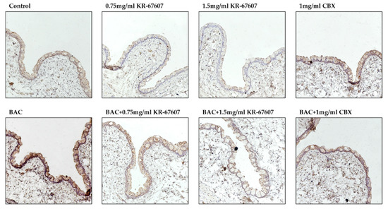 Inflammatory cytokines such as interleukin-6 (IL-6) and TNF-α are secreted by BAC. And it doesn’t wash out well, so it stays on my eyes for a long time. As a result, BAC causes inflammation, allergies, fibrosis and DES [22]. The expression level of TNF-α was checked to see if it inhibited inflammation in the conjunctiva by KR-67607. In the IHC results, 0.2% BAC induced TNF-α expression in the conjunctival epithelial cells, which was suppressed by 0.75 mg/mL and 1.5 mg/mL KR-67607 (Figure 5). These results suggest that the protection of KR-67607 against BAC-induced DES is associated with the protection of the corneal epithelium via the inhibition of TNF-α production. These results suggest that the protection of KR-67607 against BAC-induced DES is associated with the protection of the conjunctival epithelium via the inhibition of TNF-α production.