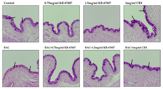 Conjunctiva’s goblet cells secrete mucus to protect the eyes, and mucus has the function of supporting immunity by clearing allergens and debris off the surface. In addition, if goblet cells do not secrete mucus properly, the tear film may not form, thus causing DES and ocular surface inflammatory diseases [31,32,33]. To examine whether the protective effects of KR-67607 against DES are associated with mucus secretion in the conjunctival epithelium, the effects of KR-67607 on mucus secretion were measured by PAS staining in the conjunctiva of SD rat eyes. BAC reduces mucus secretion in goblet cells, which is improved by KR-67607 (0.75 mg/mL and 1.5 mg/mL). (Figure 6). These results show that the protection of KR-67607 against BAC-induced DES is associated with the induction of mucus secretion.