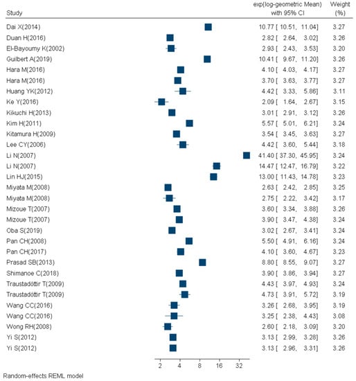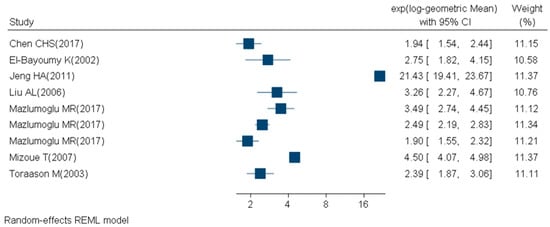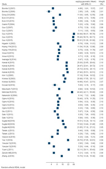 | [53] | Control group | spot urine | Korea | 416 | 64.4 | 92 | 324 | 28.1% | 23.7 | 5.06 | 4.55–5.62 | μg/g | 5 | 2 | ||||