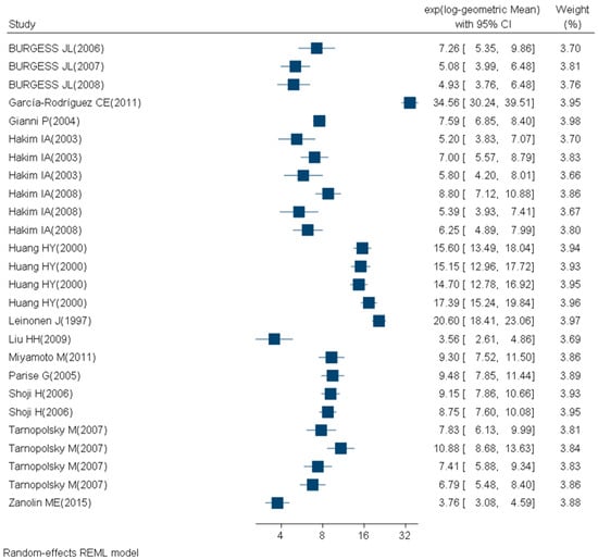| [84] | Green tea group baseline value | spot urine | USA | 35 | 18–79 | 27 | 8 | 100% | 26.5 | 10.8 ± 1.3 ** | ng/mg | 9 | 2 | |||