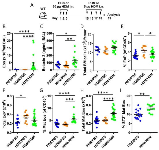 Effects of airway exposures to house dust mite (HDM) on eosinophil development and ST2 expression in the bone marrow. (A) Allergen inflammation model where wild type (WT) mice received intranasal (i.n.) doses of HDM extract or phosphate buffer saline (PBS) vehicle on days 1–3 and 15–18 and were sacrificed 24 h after the final exposure. (B) Total number of eosinophils in bronchoalveolar lavage (BAL) analyzed by differential cell count. (C) Concentration of CCL24/Eotaxin-2 in BAL measured by ELISA. (D) Total number of bone marrow cells per femur. (E) Number of eosinophil progenitors among all CD45+ bone marrow leukocytes. (F) Total number of eosinophil progenitors per femur. (G) Number of mature eosinophils among CD45+ bone marrow leukocytes. (H) Total number of mature eosinophils per femur. (I) Numbers of ST2+ Mat Eos among all CD45+ bone marrow leukocytes. Data are representative of 2–4 independent experiments (n = 9–20/group) and displayed as the mean ± SEM. Mann–Whitney U test. * p < 0.05, ** p < 0.01, *** p < 0.001 and **** p < 0.0001. PBS/PBS = controls. HDM/PBS = HDM-sensitized. HDM/HDM = HDM-sensitized and challenged. BM = bone marrow. EoP = eosinophil progenitors. Mat Eos = mature eosinophils. ST2 = IL-33 receptor.