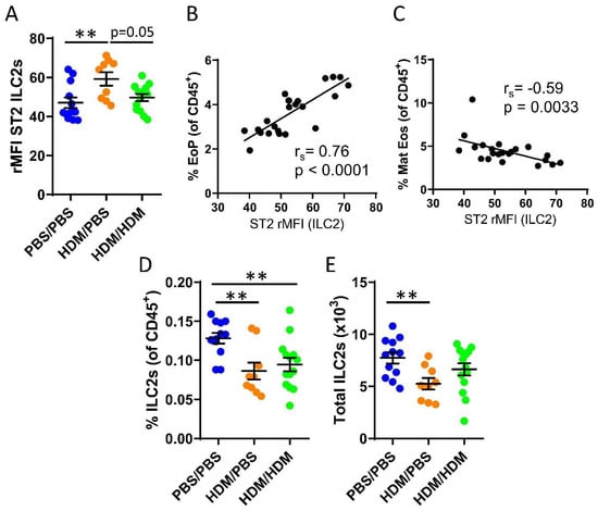 IL-33-responsive type 2 innate lymphoid cells (ILC2s) during eosinophilic inflammation in the bone marrow. (A) ST2 expression shown as relative mean fluorescence intensity (rMFI) on bone marrow ILC2s. Correlation plots of rMFI ST2 on ILC2s and the number of (B) eosinophil progenitors and (C) matures eosinophils in HDM/PBS and HDM/HDM mice. Number of ILC2s (D) among all CD45+ bone marrow leukocytes. (E) Total number of ILC2s per femur. Data are representative of 2–3 independent experiments (n = 9–14/group) and displayed as the mean ± SEM. Mann–Whitney U test. ** p < 0.01. Correlations using Spearman’s rho, with rs indicating the Spearman correlation coefficient. PBS/PBS = controls. HDM/PBS = HDM-sensitized. HDM/HDM = HDM-sensitized and challenged. EoP = eosinophil progenitors. Mat Eos = mature eosinophils. ST2 = IL-33 receptor.