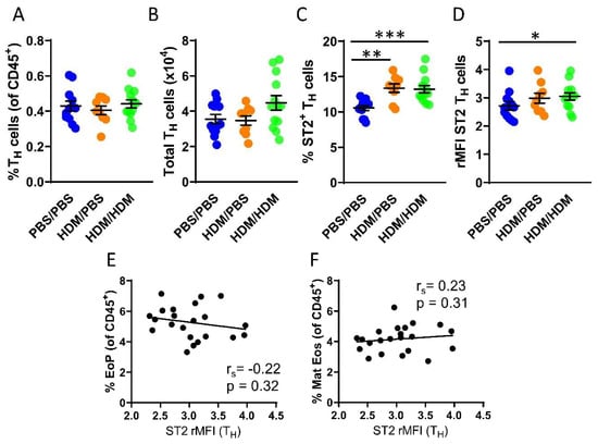 IL-33-responsive TH cells during eosinophilia in the bone marrow. (A) Number of TH cells among all CD45+ bone marrow leukocytes. (B) Total number of TH cells per femur. (C) Number of ST2+ TH cells. (D) ST2 expression on TH cells shown as rMFI. Correlation plots of rMFI ST2 on TH cells and the number of (E) eosinophil progenitors and (F) matures eosinophils in HDM/PBS and HDM/HDM mice. Data are representative of 2–3 independent experiments (n = 9–13/group) and displayed as the mean ± SEM. Mann-Whitney U test. * p < 0.05, ** p < 0.01 and *** p < 0.001. Correlations using Spearman’s rho, with rs indicating the Spearman correlation coefficient. PBS/PBS = controls. HDM/PBS = HDM- sensitized. HDM/HDM = HDM-sensitized and challenged. EoP = eosinophil progenitors. Mat Eos = mature eosinophils. ST2 = IL-33 receptor.