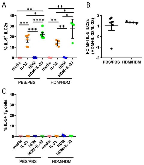 IL-5 is critical in the regulation of eosinophil production, maturation, and survival in the bone marrow. We investigated whether HDM and IL-33 stimulations ex vivo induced the production of IL-5 in ILC2s and TH cells. Additionally, we examined if cells from allergen-challenged mice responded differently compared to cells from control mice. IL-33 stimulation induced IL-5 production by ILC2s, as previously demonstrated (Figure 4A) [22,33]. Notably, the combination of HDM+IL-33-induced IL-5 production by ILC2s to a significantly higher level than IL-33 alone (Figure 4A). The intensity of IL-5, measured by mean fluorescence intensity (MFI), was increased in ILC2s in bone marrow cultures stimulated with HDM+IL-33 compared to IL-33 only (Figure 4B), whereas HDM alone did not induce IL-5 production by ILC2s (Figure 4A). Moreover, none of the stimuli induced IL-5 production by TH cells (Figure 4C). The bone marrow cells from PBS/PBS and HDM/HDM responded equally to each condition (Figure 4A–C). Collectively, these data indicate that a potential synergistic effect of HDM and IL-33 on IL-5 production by ILC2s may exist. Future studies are needed in order to explore the biological impact that this synergy might have on eosinophilic inflammation. In line with our previous data, we show that bone marrow ILC2s are an important source of IL-5 and that these cells are not mirroring the function of their adaptive counterpart TH2, which did not produce IL-5 under the examined conditions.