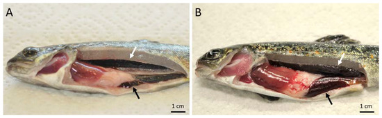 Brown trout exhibiting clinical signs of proliferative kidney disease. (A) Unexposed control brown trout having normal spleen (black arrow) and kidney (white arrow). (B) Exposed brown trout showing swollen spleen (black arrow), and swollen kidney (white arrow).