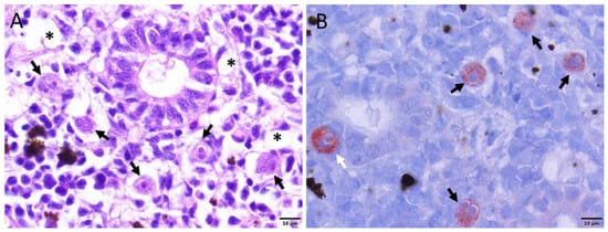 Histopathology and immunohistochemistry of kidney sections. (A) Kidney showing renal degeneration (asterisk) and pre-sporogonic stages of the parasite (black arrows) in the renal interstitium. (B) Pre-sporogonic (black arrows) and interepithelial stages of the parasite (white arrow). This section was stained using immunohistochemistry and a hematoxylin counter-stain.
