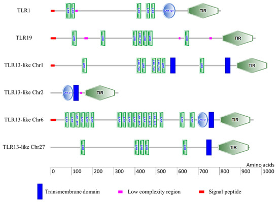 Typical conserved functional domains such as the LRR domain, TIR domain, and TM domain were observed in the predicted TLR proteins (Figure 3). In each predicted TLR protein, the number of LRR domains differed. For instance, TLR1, TLR19, TLR13-like Chr1, TLR13-like Chr6, and TLR13-like Chr27 had 5, 7, 7, 17, and 5 LRR domains, respectively. However, TLR13-like Chr2 was shorter in length and did not have any LRR domain. Similarly, TLR1, TLR13-like Chr2, and TLR13-like Chr6 had one LRR C-terminal (LRR-CT) domain each. TM domain was absent in TLR1 and TLR19, whereas all four TLR13-like proteins had a TM domain. A putative signal peptide was observed in the N-terminal region of TLR1 (1–19 amino acids), TLR19 (1–26 amino acids), TLR13-like Chr1 (1–20 amino acids), and TLR13-like Chr6 (1–27 amino acids).