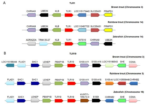 Comparative synteny analysis of TLRs. The analysis of TLRs was performed using the Genomicus online database, NCBI, and ENSEMBL genome database. The arrows indicate the transcriptional direction and the same genes are represented in similar color across species. (A) TLR1 synteny arrangement (brown trout chromosome 3—NC_042959.1; rainbow trout chromosome 14—NC_035090.1; zebrafish chromosome 14—genomicus database); (B) TLR19 synteny arrangement (brown trout chromosome 3—NC_042959.1; rainbow trout chromosome 3—NC_035079.1; zebrafish chromosome 16—genomicus database). The full names of gene symbols are provided in Supplementary Table S1.