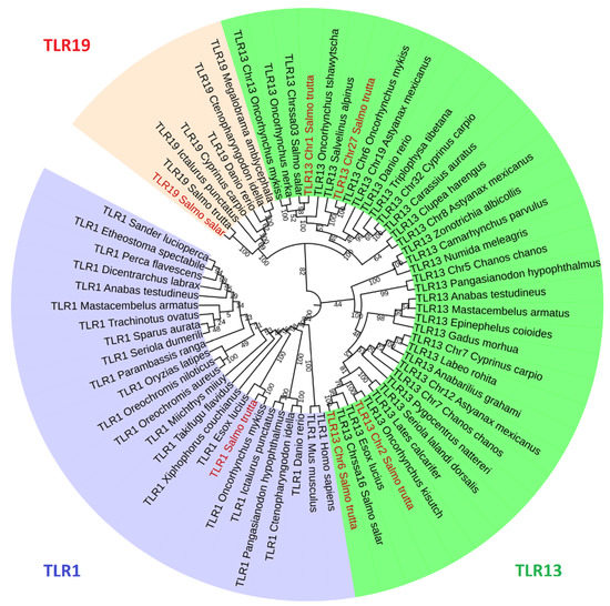 Phylogenetic tree of TLRs from different vertebrates. The tree was generated using MEGA X using the maximum likelihood method. The different gene groups are denoted by various colors, TLR1—blue; TLR19—red; TLR13-like—dark green. The leaves with red legend indicate brown trout TLRs. The GenBank accession numbers of the sequences are available in Supplementary Table S2.