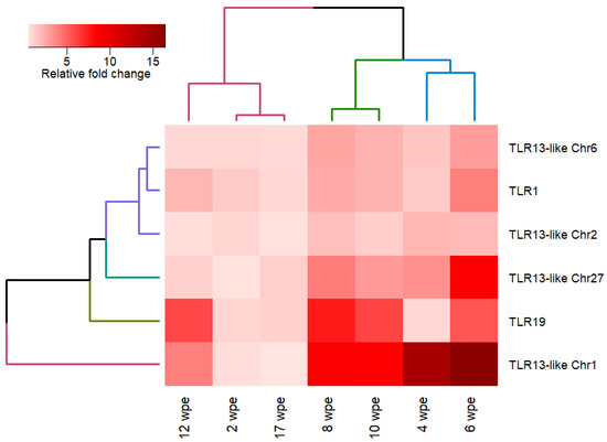 TLR13-like Chr1 was significantly up-regulated in the kidney at all time points except 2 and 17 wpe. A strong up-regulation of TLR13-like Chr1 was noticed at 6 wpe (16.3 fold). Similarly, TLR13-like Chr27 was up-regulated at 4–10 wpe with a peak at 6 wpe (8.7 fold). However, TLR13-like Chr2 and TLR13-like Chr6 had a moderate up-regulation at 6–10 wpe. Overall, the expression of all tested TLRs except TLR13-like Chr27 was non-significantly down-regulated at 17 wpe during PKD pathogenesis (Figure 7). There was no significant difference in the expression pattern of all the examined TLRs in the kidney of exposed and control groups at 2 wpe and 17 wpe, and these two time points were clustered together in hierarchical clustering (Figure 8).