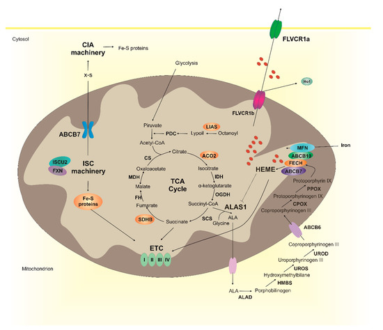 Heme metabolism and Fe-S cluster biogenesis are interconnected. The ISC machinery (composed by ISCU2, FXN, and other 16 proteins) is responsible for the generation of Fe-S clusters necessary for several mitochondrial proteins (in orange), including those of the electron transport chain (ETC), some enzymes of the TCA cycle (ACO2 and SDHB) and LIAS. The ISC machinery is also responsible for the generation of a X-S compound that is exported in the cytosol by ABCB7 and used by the CIA machinery for the generation of Fe-S clusters to be incorporated into non-mitochondrial proteins. Heme is synthesized through eight enzymatic reactions occurring between mitochondria and cytosol. The availability of free heme is further controlled at the level of heme catabolism (HO1) and heme export (FLVCR1a and FLVCR1b). FLVCR1b has been drawn on both mitochondrial membranes, however its specific subcellular localization still remains to be determined. Although not shown in the picture other heme importers and exporters have been identified (see the text for details). Both heme and Fe-S clusters are necessary for the ETC activity. Interestingly, the biosynthetic pathways of the two cofactors are strongly interconnected. Indeed, heme synthesis depends on Fe-S clusters for succinyl-CoA supply, for the expression of ALAS1 and FECH. Whether Fe-S clusters biogenesis depends on heme is less clear.