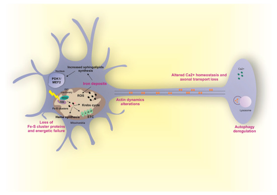 Altered molecular mechanisms in FRDA affected neurons. Frataxin (FXN) deficiency in FRDA results in the degeneration of specific neuron types leading to the ataxia phenotype. Different hypotheses have been postulated regarding the pathophysiological mechanism at the basis of neurodegeneration. FXN is a mitochondrial protein involved in Fe-S clusters biogenesis and alterations in FXN activity results in mitochondria dysfunctions and iron accumulation. The presence of iron deposits in mitochondria has been observed in patient-derived samples; however, whether iron accumulation occurs in neurons is less clear. Iron might be toxic and cause cellular dysfunctions by mediating the catalysis of ROS via Fenton reaction. However, a ROS-independent mechanism of iron toxicity has also been proposed. In this model, neurodegeneration arises from increased sphingolipids synthesis and activation of PDK1/Mef2 pathway occurring upon iron accumulation. Independently of iron accumulation, FXN deficiency results in reduced activity of Fe-S cluster containing enzymes leading to alteration in metabolic flow (aconitase), energetic failure (ETC), and altered heme synthesis (FECH). Moreover, a role of FXN in the regulation of calcium homeostasis has been described and linked to failure of retrograde axonal transport along axons and autophagy deregulation. Aberrant autophagy levels have been also reported in other independent works. However, whether autophagy is a neurodegenerative mechanism or a defense mechanism still need to be clarified. Finally, FXN deficiency may control actin dynamics and the growth cone of neurons. All hypotheses have been well described. However, which of them is the primary event triggering the neurological phenotype in FRDA is still unknown.
