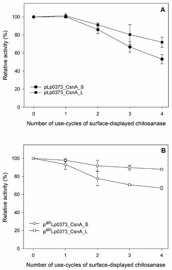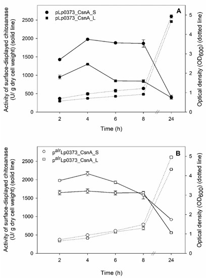 - Nguyen, H.M.; Mathiesen, G.; Stelzer, E.M.; Pham, M.L.; Kuczkowska, K.; Mackenzie, A.; Agger, J.W.; Eijsink, V.G.H.; Yamabhai, M.; Peterbauer, C.K.; et al. Display of a beta-mannanase and a chitosanase on the cell surface of Lactobacillus plantarum towards the development of whole-cell biocatalysts. Microb. Cell Fact. 2016, 15, 169. [Google Scholar] [CrossRef] [PubMed]