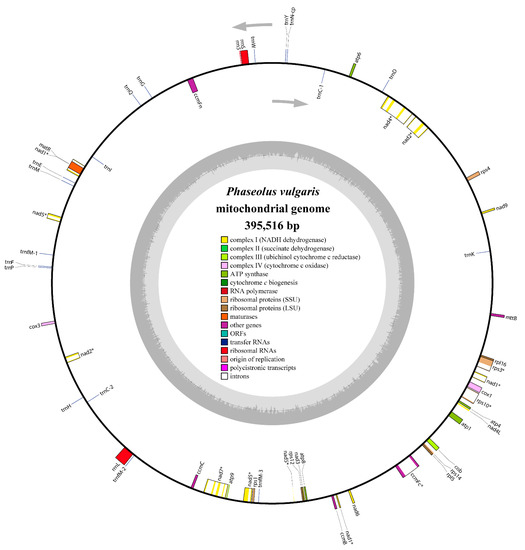 The complete genomic sequence of the P. vulgaris mitogenome was submitted to the NCBI Genome Database (https://www.ncbi.nlm.nih.gov/genome/browse/) under accession number NC_045135.1. The mitogenome was assembled into a typical circular molecule 395,516 bp in length (Figure 2), similar to the mitochondria of some papilionoid legumes such as G. max (402,558 bp), G. soja (402,545 bp), L. japonicus (380,861 bp), V. angularis (404,466 bp), and V. radiata var. radiata (401,262 bp; Table S2). In fact, the mitogenome sizes vary considerably among the papilionoid legumes, ranging from 271,618 bp in Medicago truncatula to 588,000 bp in Vicia faba. Mitogenome sizes can vary greatly in different cultivars of the same species. For example, the mitogenome size of G. max Aiganhuang (N21249) is 402,558 bp, whereas that of G. max cultivar Zhonghuang 13 is 513,779 bp [51].