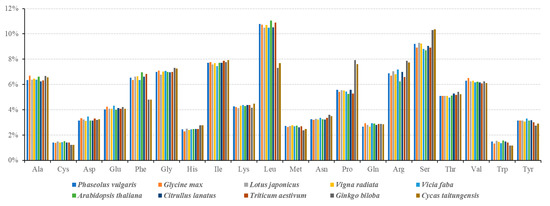 Codon usage pattern of P. vulgaris mitogenome compared with nine other higher plants. The proportion of each amino acid residues to the whole mitochondrial proteins is shown on the Y-axis. Ginkgo biloba and Cycas taitungensis are gymnosperms, while others are angiosperms.