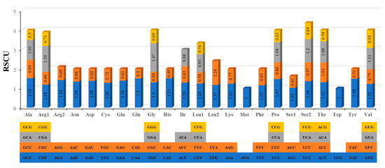 Relative synonymous codon usage (RSCU) of P. vulgaris mitogenome. Codon families are on the X-axis. RSCU values are the number of times of a particular codon, relative to the number of times that the codon would be observed for a uniform synonymous codon usage.