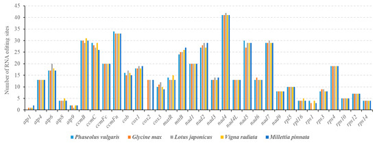 Previous studies have shown that the frequency and type of RNA editing in each organelle is highly lineage-specific [26,65,69,70]. As shown in Figure 6, the number of predicted RNA editing sites in different papilionoid legume mitogenomes is very conserved, ranging from 486 sites in P. vulgaris to 503 sites in Lotus japonicus, suggesting that they share extremely conserved PCGs. In angiospermous mitogenomes, nearly all of the RNA editing sites are C to U, and the number of RNA editing sites is concentrated between 400 to 500. For example, 463 and 444 RNA-editing sites were found in the C. lanatus and C. pepo mitogenomes, of which 394 are shared [8]; 441 and 427 RNA-editing sites were found in A. thaliana and B. napus mitogenomes, of which 358 are shared [10]. In the gymnosperm Cycas taitungensis, 1084 RNA editing sites were found in its mitogenome [71]. The clearly descending number of RNA editing sites is in accordance with gene losses from gymnosperms to angiosperms. In contrast to angiosperms and gymnosperms, both types of C-to-U and U-to-C conversions are found in the mitochondrial transcripts of ferns and hornworts [69,72].