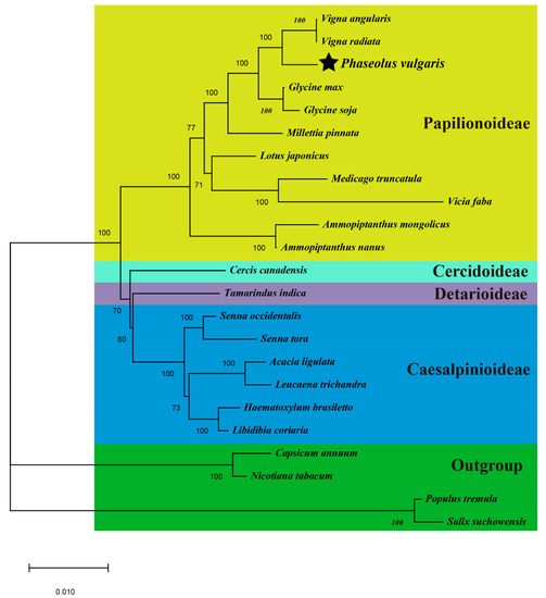 In order to accurately infer the phylogenetic relationships of P. vulgaris within the Fabaceae family, maximum likelihood (ML) analysis was performed based on the conserved mitochondrial PCGs (amino acid sequences) of 23 higher plants. The NCBI accession numbers and abbreviations of all these observed mitogenomes are listed in Table S2. Apart from the 19 representative Fabaceae species, taxon sampling also included two species of Solanales (C. annuum and N. tabacum) and two species of Malpighiales (P. tremula and S. suchowensis) as outgroups. The single-copy orthologous PCGs common among the 23 analysed species were selected with local Perl scripts. All conserved mitochondrial PCGs were extracted from each mitogenome. The conserved gene sequences from the mitogenome were concatenated into a single dataset and aligned using Muscle software with default settings [50]. Poorly-aligned sequences were deleted or manually adjusted for each alignment. Prior to constructing the phylogenetic tree, we applied MEGA X to determine the most appropriate amino acid substitution model [41]. Based on the model selection results, the ML tree based on a JTT + F model with a gamma distribution was constructed using MEGA X. The bootstrap index value (%) in which the associated taxa clustered together was shown next to the branches and was calculated from 1000 replications.