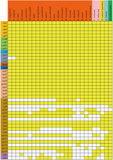 As described by Richardson et al. [75], the mitochondrial genomes of higher plants vary significantly in genome size, gene content and order. Losses of PCGs occurred frequently during the evolution of higher plants. The phylogenetic tree provides a backdrop for the further analysis of gene loss during evolution, and the gene contents of all observed species are summarized in Figure 9. Most of the PCGs were conserved in different plant mitogenomes, especially for the genes in the groups of Complex I, Complex III, Complex V, cytochrome c biogenesis, maturases, and transport membrane protein [13]. The conservation of these genes suggests that they play crucial roles in the function of mitochondria. However, the ribosomal proteins and succinate dehydrogenase genes were highly variable. As shown in Figure 9, the cox2 gene was only lost in the subfamily Phaseolinae (V. angularis, V. radiata, and P. vulgaris) but retained in other leguminous plants, suggesting that this gene was lost after separation from the subfamily Glycininae. The rpl2 gene was lost in most leguminous plants but regained in A. ligulate, L. trichandra, H. brasuletto, and L. coriaria, suggesting that this gene was lost before the emergence of Fabales but could be regained in some leguminous plants. Similar phenomena were found in many ribosomal proteins (rpl10, rpl16, rps7, rps10, and rps19). Additionally, rpl6 and rps8 genes were lost from liverworts (M. polymorpha) during evolution [76], the rps11 gene was lost from gymnosperms (G. biloba) and liverworts during the divergence of the angiosperms and gymnosperms [77], and the rpl10 gene was lost in monocots and gymnosperms but regained in dicots [33,78]. The enhanced loss of ribosomal proteins in plant mitogenomes indicates that these genes were encoded partly by mitochondrial native genes and partly by nuclear genes, due to the gene transfer between mitochondria and nucleus [79,80,81].