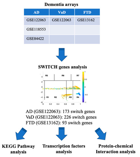 The following are available online at https://www.mdpi.com/1422-0067/21/11/3787/s1, Table S1. Switch genes identified in the frontal cortex of AD subjects compared to non-demented controls (GSE122063). Table S2. Switch genes identified in the frontal cortex of VaD subjects compared to non-demented controls (GSE122063). Table S3. Switch genes identified in the frontal cortex of FTD subjects compared to non-demented controls (GSE13162). Table S4. Shared and unique switch genes in the dementia. Table S5. Pathway analysis of switch genes in the frontal cortex of AD, VaD and FTD subjects. Table S6. Shared and unique pathways. Table S7. Comparison of the genes, pathways and transcription factors during the initiation and progression of dementia. Figure S1. Venn Diagram analysis of the genes, pathways and transcription factors during the initiation and progression of dementia. (a–c) Venn diagram analysis of differentially expressed genes (DEG) and Switch genes in AD (a), VaD (b) and FTD (c). (d–f) Venn diagram analysis of pathways identified from differentially expressed genes (DEG) and Switch genes in AD (d), VaD (e) and FTD (f). (g–i) Venn diagram analysis of transcription factors identified from differentially expressed genes (DEG) and Switch genes in AD (g), VaD (h) and FTD (i).