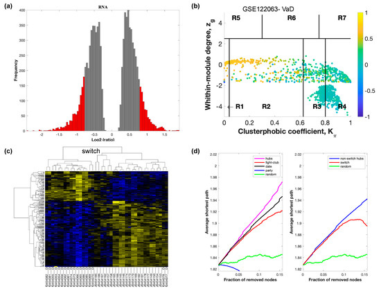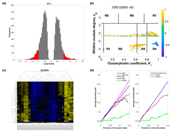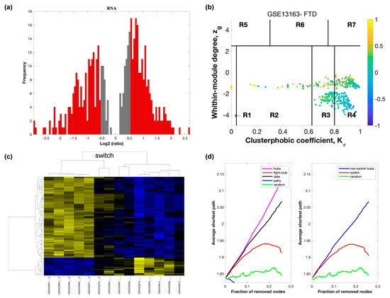 SWIM analysis of the frontal cortex of FTD subjects in GSE13162. (a) Distribution of log2 fold change values where the red bars are selected for further analysis. (b) Heat Cartography Map with nodes colored by their average Pearson Correlation Coefficient. Region R4 represents the switch genes. (c) Dendrogram and heat map for switch genes. The suffix _D indicates the sample came from the diseased cohort. (d) Robustness of the correlation network.