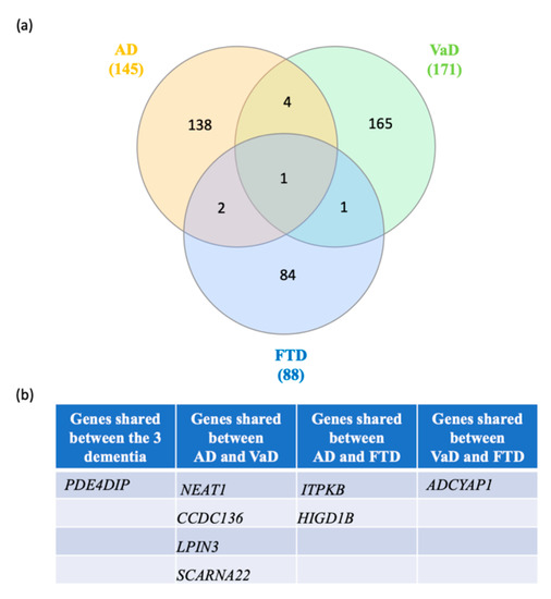 Venn diagram analysis of the switch genes shared in AD, VaD and FTD. (a) Venn analysis was performed using the following website: http://www.interactivenn.net/. (b) List of the switch genes shared between each dementia.