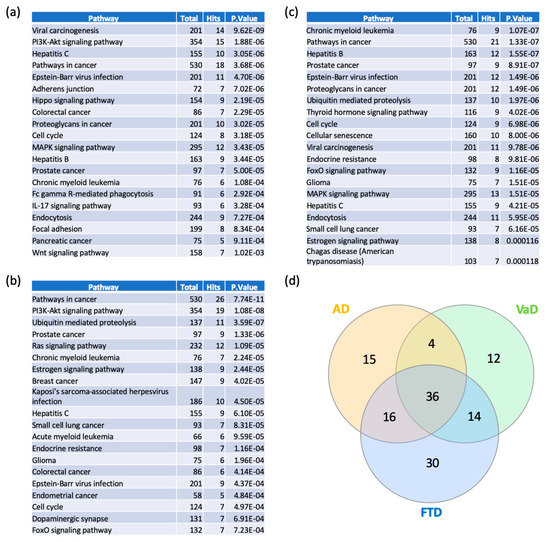 Pathway analyses of switch genes of AD, VaD and FTD patients. Pathway analysis was performed using NetworkAnalyst on tissue-specific networks derived from the protein-protein interaction database from the frontal cortex. The minimum connected network was selected for further pathway analysis. Results from the pathway analysis are derived from the Kyoto Encyclopedia of Genes and Genome (KEGG). Totals refers to the total number of genes that are known to be involved in the KEGG pathway and hits refers to the number of genes identified in this analysis that are involved in the pathway. The 20 top dysregulated pathways ranked according to the p-value are presented in the table. (a) AD pathways, (b) VaD pathways, (c) FTD pathways, and (d) Venn diagram analysis of the dysregulated pathways in AD, VaD and FTD.