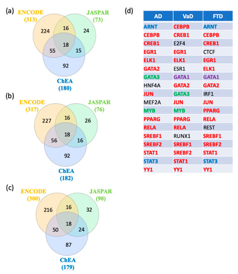 In order to identify key regulators of switch genes obtained from AD, VaD, and FTD, gene transcription factors, interactomes were performed using NetworkAnalyst [22] with the ENCODE, JASPAR, and ChEA databases. A total of 18 shared transcription factors regulating the switch genes for each dementia were revealed by Venn analysis (Figure 7a–c). Interestingly, we observed that 12 transcription factors are shared between the three types of dementia (Figure 7d). Only two and three transcription factors were unique to VaD and FTD, respectively (Figure 7d).