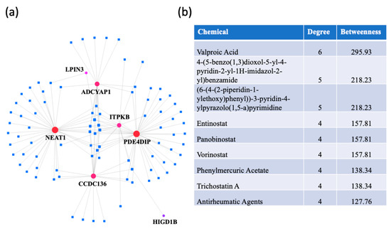 A protein–chemical interaction network analysis revealed drugs that are potentially useful for treating dementias. The switch genes that are shared between two or three dementias were used to create the network (Figure 8a). The highest ranked compounds, with a degree ≥ 4, are shown in Figure 8b. The most highly ranked chemical, valproic acid, was associated with NEAT1, LPIN3, ADCYAP1, CCDC136, ITPKB, and PDE4DIP. Several other chemicals were part of the HDAC inhibitor family (entinostat, panobinostat, vorinostat, trichostatine (A). In addition, antirheumatic agents were identified, suggesting a role of inflammation in dementia pathogenesis.