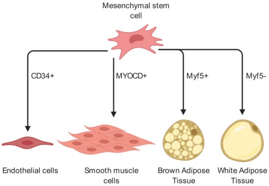 Cell fate of mesenchymal stem cells related to angiogenesis and adipogenesis. MSCs in adipose tissue may differentiate into a variety of cell types including endothelial cells, smooth muscle cells as well as white or brown adipocytes and thereby contribute to angiogenesis and neovascularization. In adipogenesis, Myf5+ and Myf5- cells mark two distinct populations which diverge early in adipogenesis. Myf5+ cells will differentiate into brown adipose tissue while Myf5- will differentiate into white adipose tissue. CD34 is an endothelial cell marker, while MYOCD is a marker for smooth muscle cell differentiation [20,21]. (Created with BioRender).