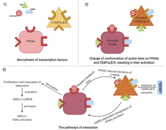 Peroxisome proliferator-activated receptor γ (PPARγ) transcriptional signaling cascade, acting in adipose progenitor cells (APCs), is crucial for adipose stem cell niche expansion, regulating tissue homeostasis and repair [31]. Two stages of establishment of the PPARγ transcriptional network are distinguished. At first, groups of transcription factors are recruited, including an activator of the glucocorticoid receptor (GR), a signal transducer, an activator of transcription 5A (STAT5A) and CREB activates PPARγ and CCAAT/enhancer-binding proteins [37]. C/EBPβ is then bound by pocket proteins (Rbs) and the complex C/EBPβ–Rbs further upregulates PPARγ, which, in turn, either regulates the secretion of C/EBPβ through a negative feedback loop or induces the proliferation and maturation of adipocytes (Figure 2) [38]. Additionally, both C/EBPβ and C/EBPδ are controlled at translational level by serine/threonine kinase 40 (Stk40) [39]. Stk40 represses the levels of C/EBP proteins and the knock-out of Stk40-KO cells leads to increased levels of C/EBP proteins and promotes differentiation pathways into embryonic fibroblasts. Interestingly, the knockdown of C/EBPβ downregulates adipogenic differentiation in Stk40-KO cells. A recent study found a leucine-rich repeat containing transmembrane protein complex SWELL1-/LRRC8 to be activated following proliferation of adipose tissue mass, further regulated in adipocytes and mechanical adipocyte swelling, predisposing to SWELL1-mediated VRAC activation [40].