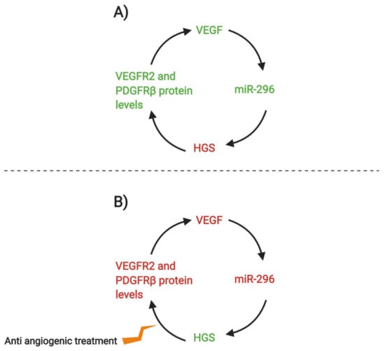 (A) Vascular endothelial growth factor (VEGF) stimulates non-coding miR-296, which then lowers the expression of platelet-derived growth factor (HGS). HGS is responsible for controlling the degradative sorting of VEGFR and platelet-derived growth factor receptor (PDGFR), so their protein expression levels are regulated. However, since miR-296 lowers HGS, then VEGF2 and PDGFRβ levels increase, stimulating VEGF activity. (B) Anti-angiogenic treatment is used to downregulate the activity of VEGFR and PDGFR, which decreases their protein levels, which could combat the effects of the miR-296 cycle [113]. (Created with BioRender).