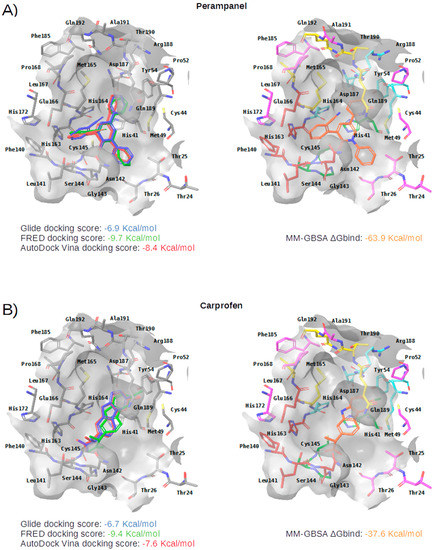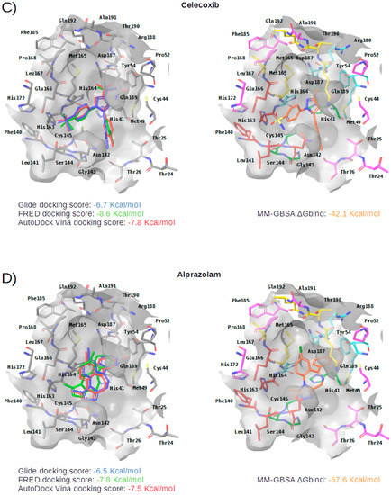 Panels (A–G) show results for Perampanel, Carprofen, Celecoxib, Alprazolam, Trovafloxacin, Sarafloxacin and Ethyl biscoumacetate; respectively. For each predicted M-pro inhibitor, the figure shows: (A) the superposition of the three equivalent docked poses (if more than one was found for the same hit, the one that presented the highest mean docking score was chosen); and (B) the corresponding Glide docked pose after the MM-GBSA minimization. Docking score values obtained with Glide, FRED and AutoDock Vina are shown in the same color as the equivalent pose obtained with the corresponding program. The ∆Gbind energy value obtained after the MM-GBSA minimization of the Glide pose is also shown for each predicted inhibitor. This figure was obtained with the help of the Maestro program [24].