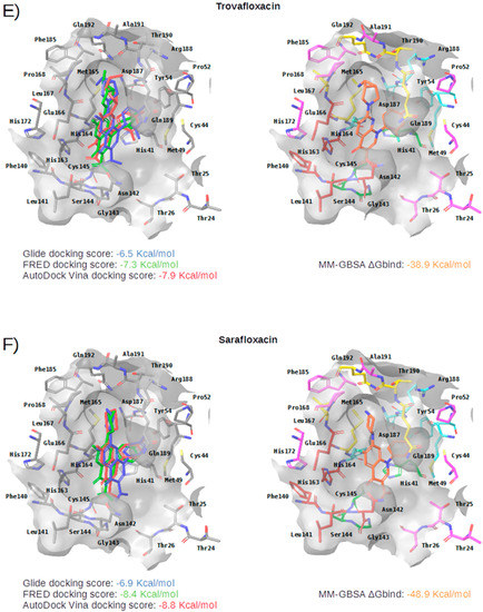 Trovafloxacin is a broad spectrum antibiotic that inhibits DNA gyrase and topoisomerase IV (see Table 4). In its predicted and minimized binding mode, the 2,4-difluorophenyl group of Trovafloxacin is buried in the hydrophobic pocket and effects hydrophobic interactions with Met165, Gln189 and Met49 (see Table 5 and Figure 5E). Interestingly, its carboxylic acid group is predicted to establish a hydrogen bond interaction with the main chain nitrogen of Ser144 and Cys145 (the latter also present in the complex with 13a and 13b; see Table 2). Additionally, the side chain of Gln189 is also involved in a hydrogen bond with the core of Trovafloxacin (see Table 5 and Figure 5E). However, according to the DrugBank database [36], this drug was withdrawn from the market due to its hepatotoxic potential, and therefore, it does not seem to be a relevant candidate for the treatment of COVID-19.